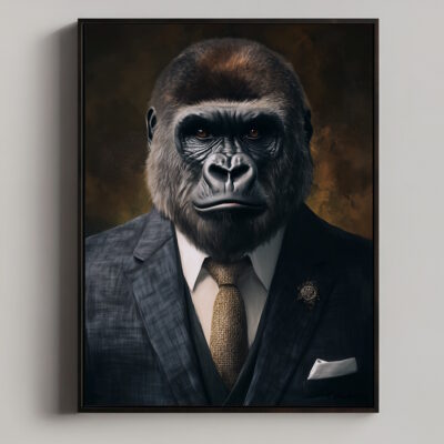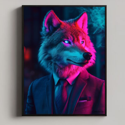 Mysterieus en onafhankelijk: White Wolf – Corporate Creatures toont een witte wolf in een elegant pak, een kunstwerk dat kracht en vrijheid symboliseert.