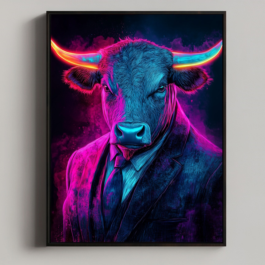 Ontketen de rauwe kracht van Bull of Fire – Neon Instincts, een opvallend kunstwerk met een krachtige stier waarvan de hoorns gloeien als gesmolten staal. De intense hitte die van de hoorns straalt, symboliseert onverzettelijke kracht en vastberadenheid, terwijl de imposante houding van de stier pure dominantie en focus uitstraalt.
