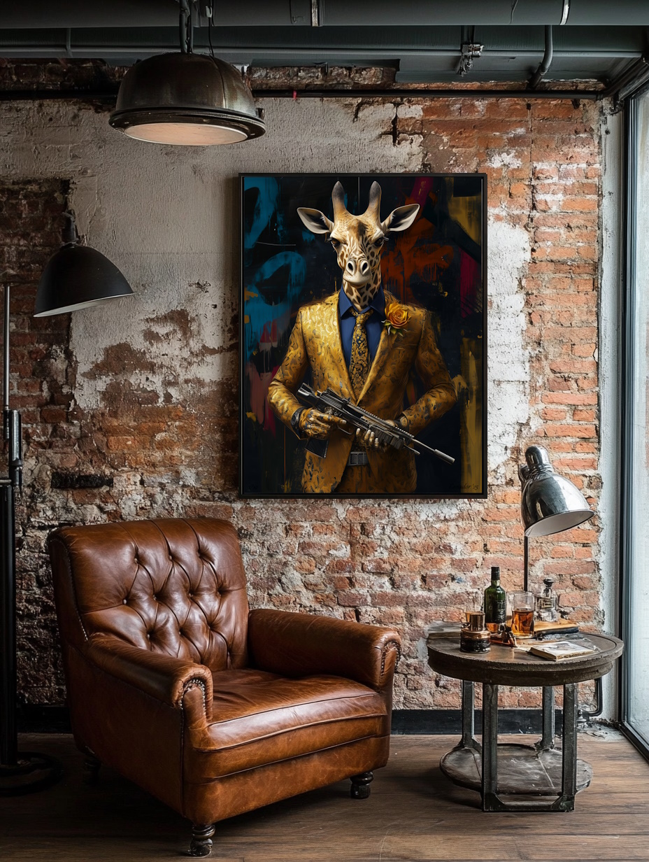 Wat als dieren hun eigen lot in handen konden nemen? Charlie G – Fierce Defenders brengt deze gedachte tot leven met een statige giraffe, gekleed in een scherpgesneden pak en gewapend als symbool van bescherming en veerkracht. Dit kunstwerk combineert elegantie en kracht met een krachtige boodschap over overleving en rechtvaardigheid in de natuur.