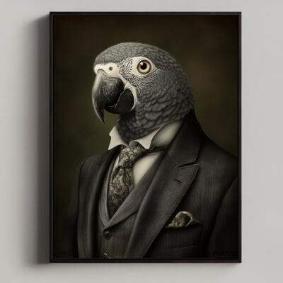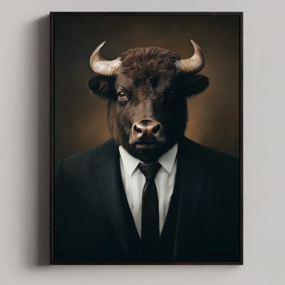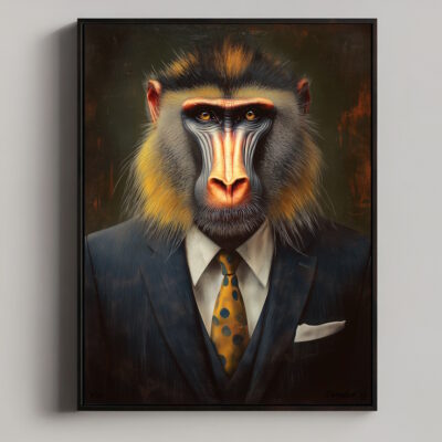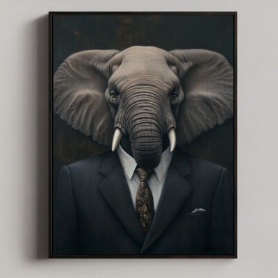 Snelheid en elegantie komen samen in Cheetah – Corporate Creatures. Dit indrukwekkende kunstwerk toont een sierlijke cheetah in een strak, op maat gemaakt zakelijk pak. Met zijn scherpe blik en verfijnde houding straalt de cheetah doelgerichtheid en autoriteit uit, een perfecte balans tussen natuurlijke kracht en professionele stijl.