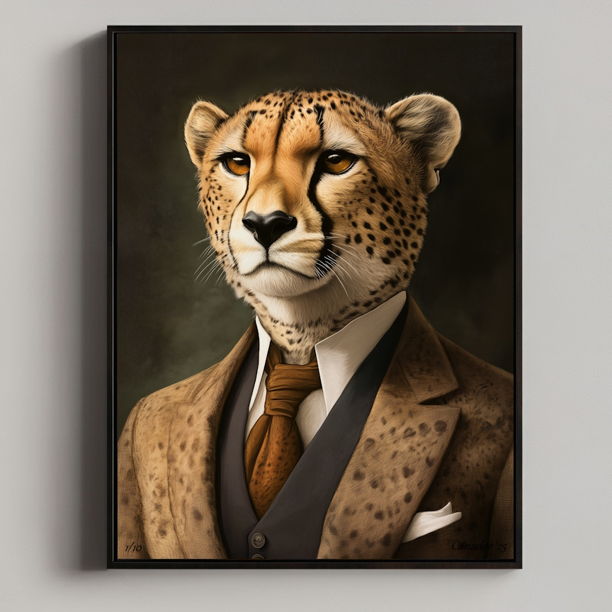 Snelheid en elegantie komen samen in Cheetah – Corporate Creatures. Dit indrukwekkende kunstwerk toont een sierlijke cheetah in een strak, op maat gemaakt zakelijk pak. Met zijn scherpe blik en verfijnde houding straalt de cheetah doelgerichtheid en autoriteit uit, een perfecte balans tussen natuurlijke kracht en professionele stijl.