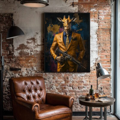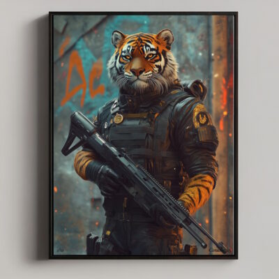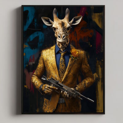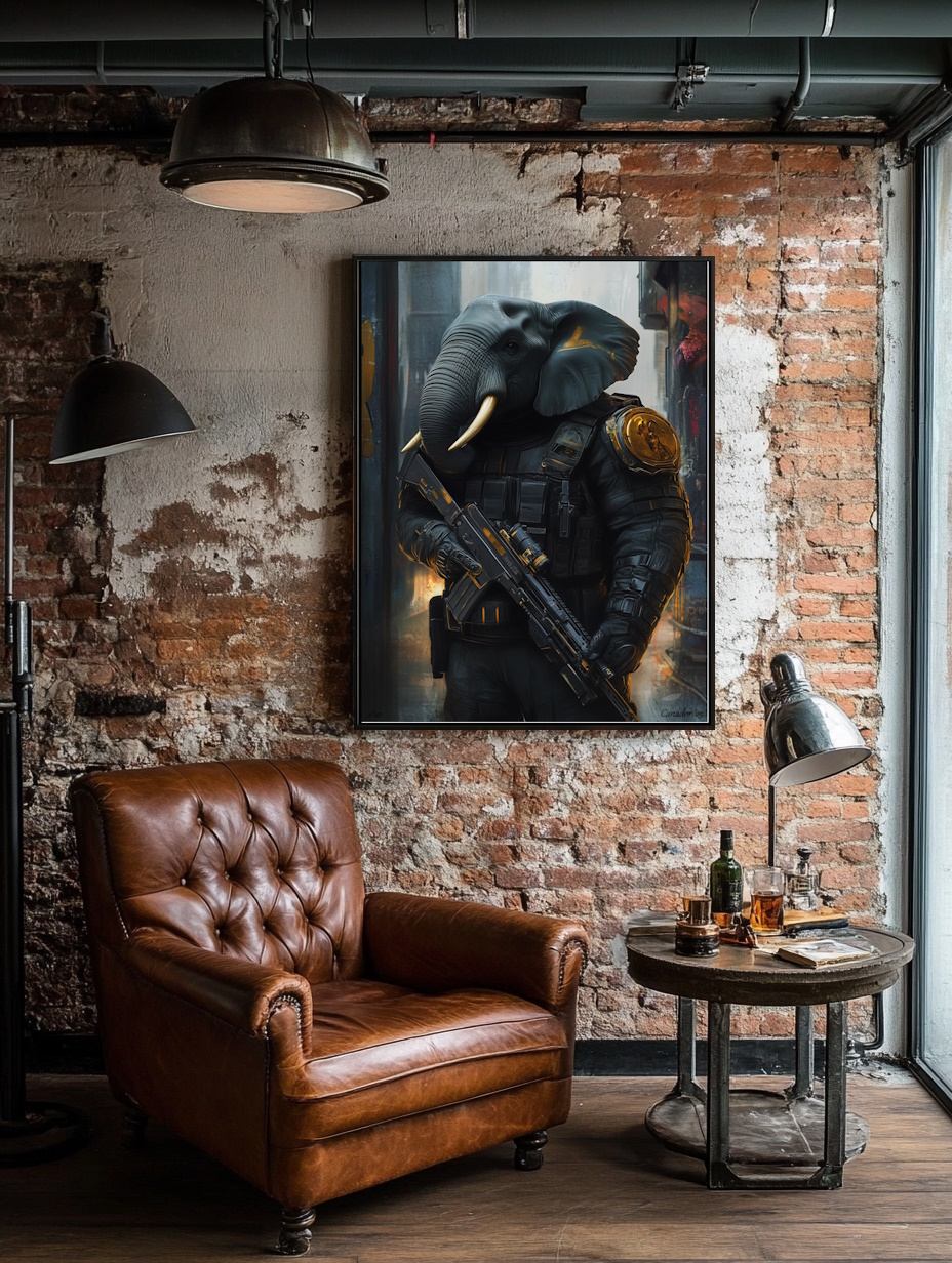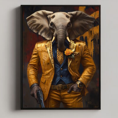 De olifant, een icoon van kracht en wijsheid, wordt hier afgebeeld als een onverschrokken verdediger van zijn eigen soort. Het gedetailleerde pantser en het wapen benadrukken de urgentie van bescherming in een wereld waarin dieren steeds meer onder druk staan. Dit kunstwerk is niet alleen een visueel meesterwerk, maar ook een oproep tot bewustwording.