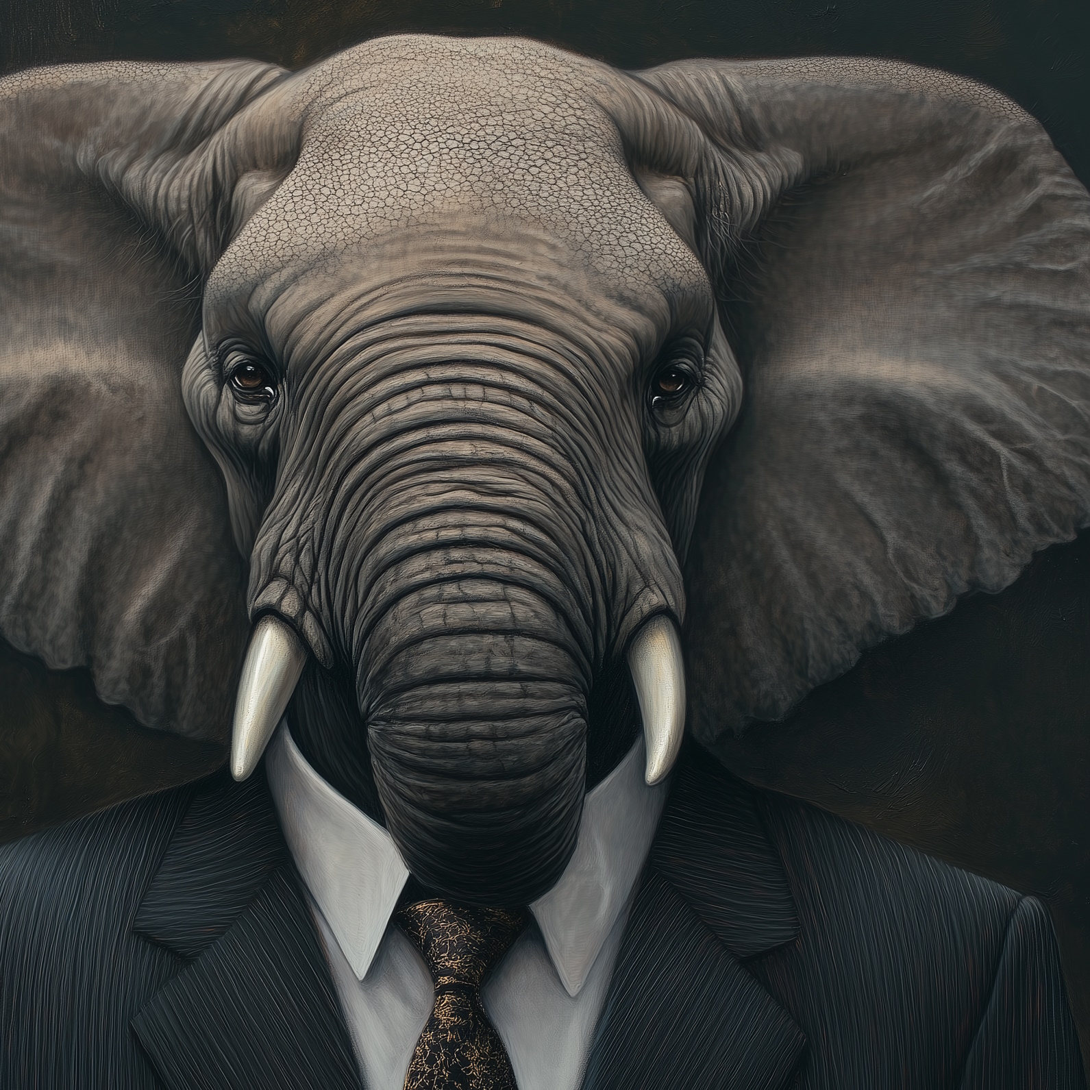 Elephant – Corporate Creatures combineert wijsheid en macht in een imposant kunstwerk. De majestueuze olifant in een op maat gemaakt pak straalt rust, intelligentie en tijdloze elegantie uit.
