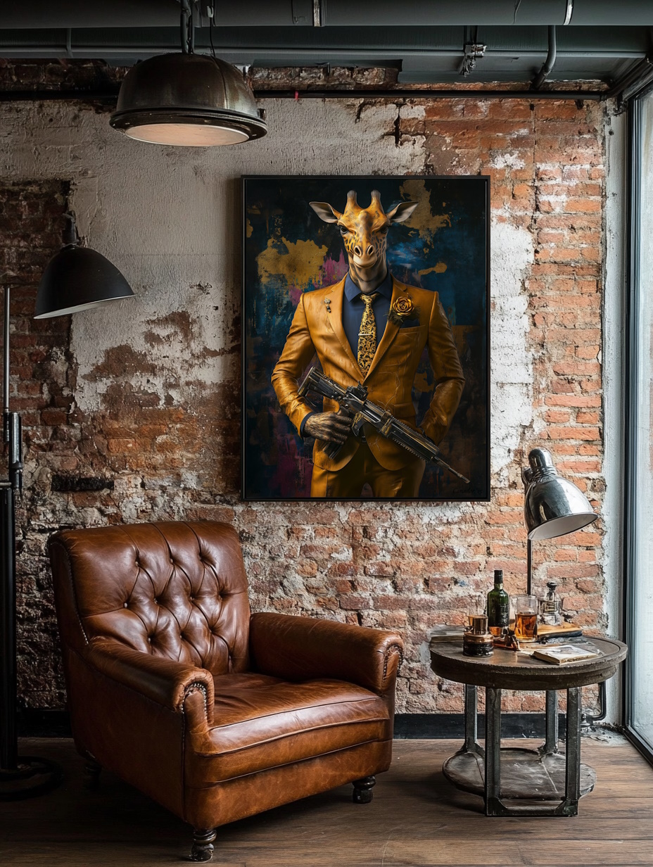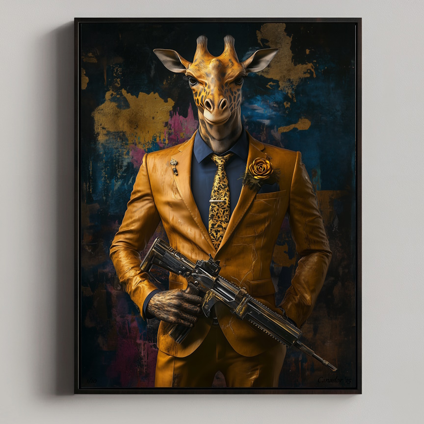 Wat als de natuur haar eigen verdediging kon organiseren? Harry G – Fierce Defenders brengt deze gedachte tot leven met een statige giraffe, gekleed in een elegant pak en bewapend als symbool van vastberadenheid en kracht. Dit unieke kunstwerk combineert verfijning en urgentie, terwijl het een krachtige boodschap van bescherming en overleving overbrengt.