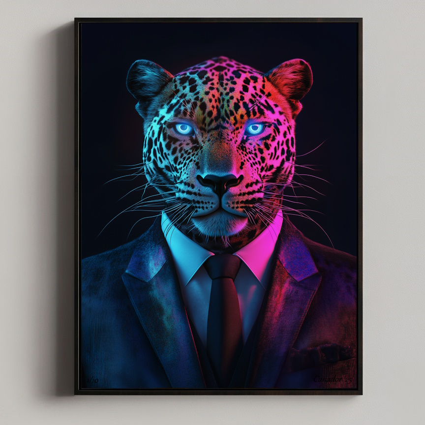 Leopard – Neon Instincts viert snelheid en elegantie, met neon-accenten die zijn dynamiek en gratie versterken. Een perfecte balans tussen kracht en stijl.
