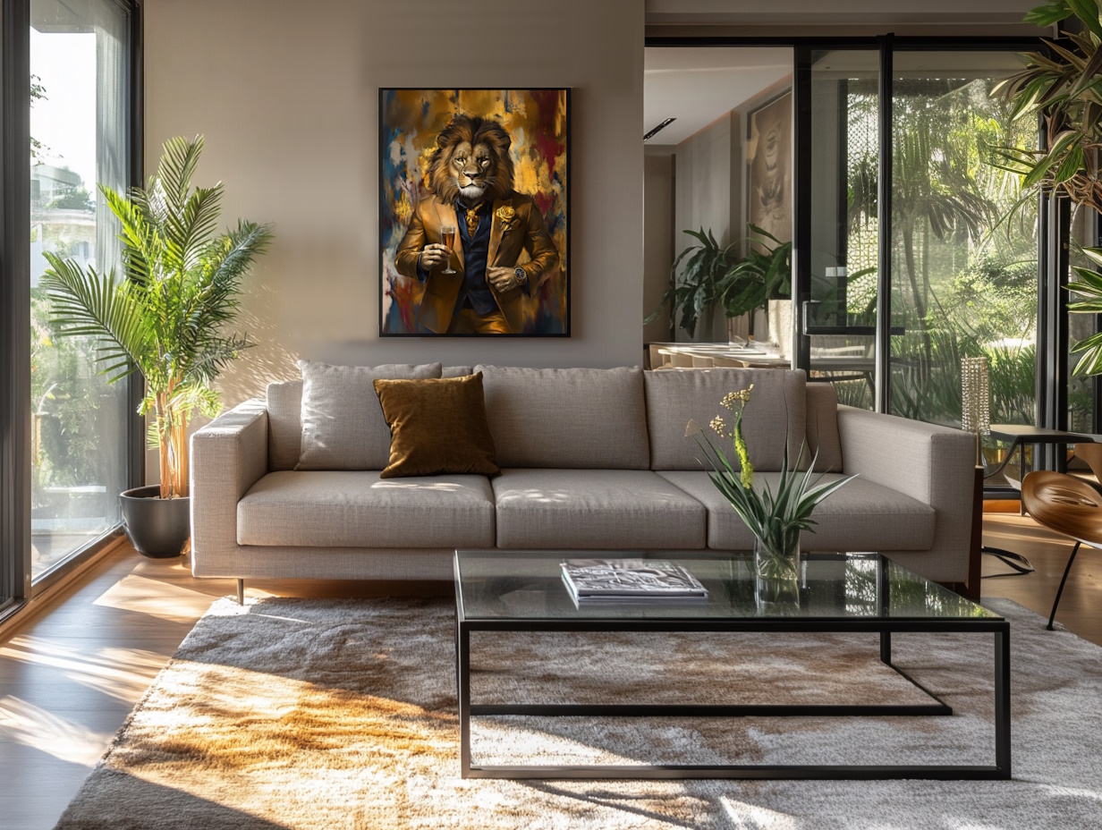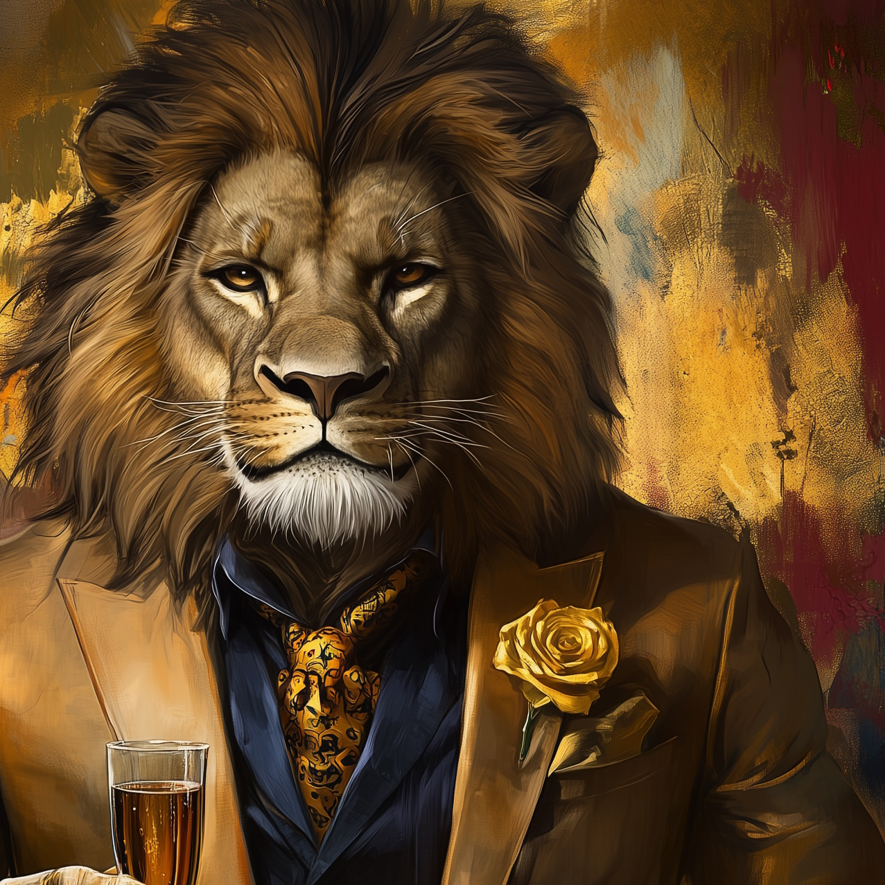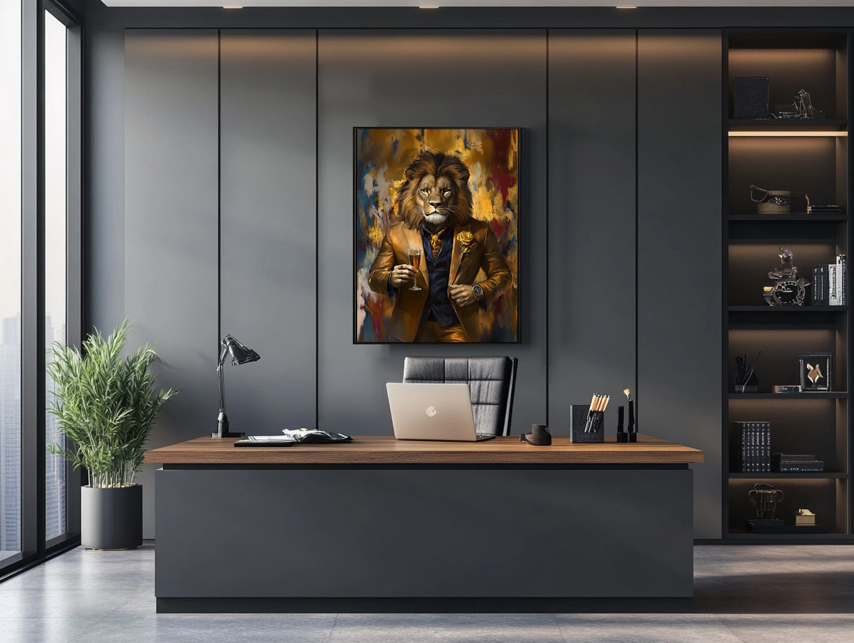 Breng kracht en leiderschap in jouw ruimte met Lion – Toast to Triumph, een kunstwerk dat majestueuze kracht en succes viert. De imposante leeuw, gehuld in een stijlvol pak en met een glas in een trotse toast, belichaamt de perfecte balans tussen autoriteit en elegantie.