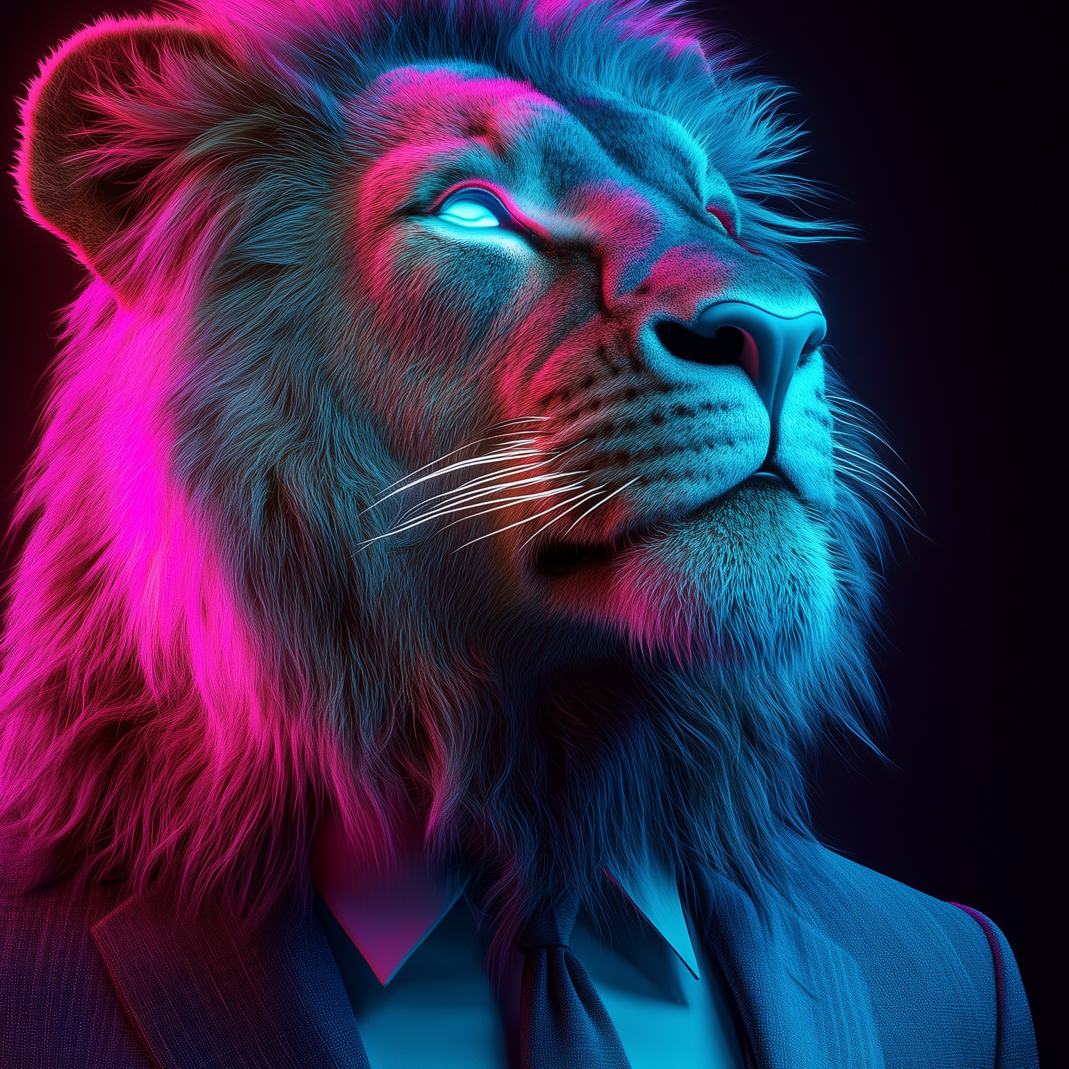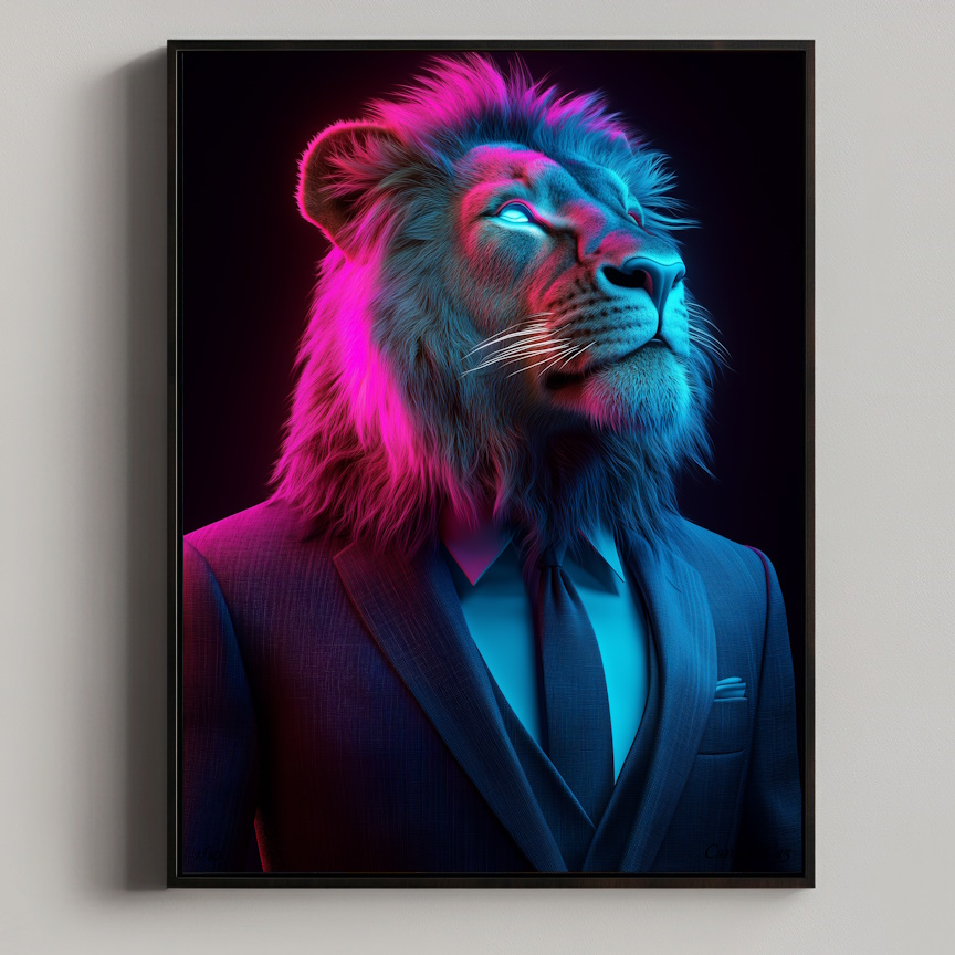 Lion Up – Neon Instincts vangt een unieke blik op de leeuw die omhoog kijkt, met een neon-touch die zijn focus en ambitie versterkt. Een krachtig en inspirerend kunstwerk.