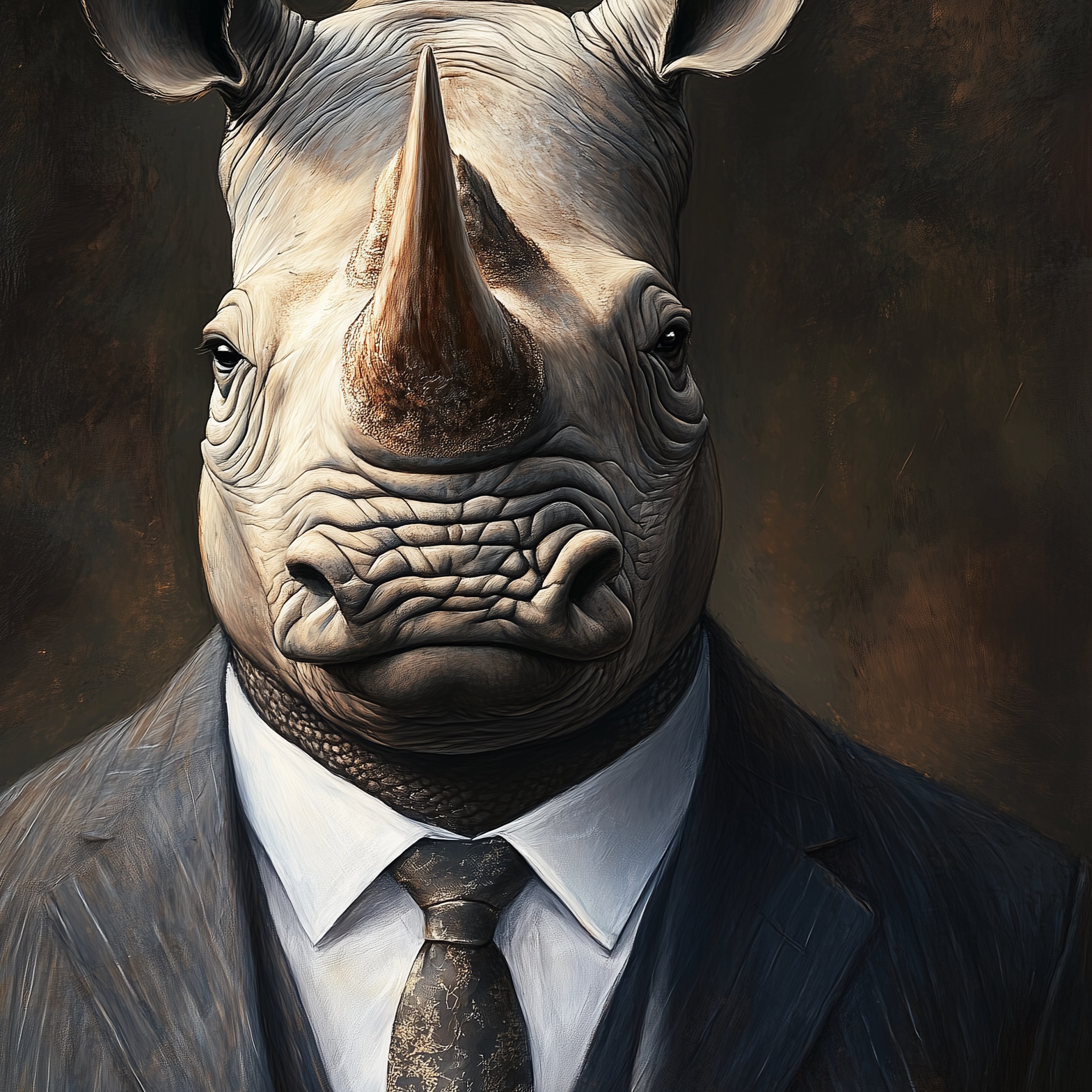 Pure kracht in beeld: Rhino Focus – Corporate Creatures toont een neushoorn in een strak pak, met intense focus en een krachtige uitstraling.