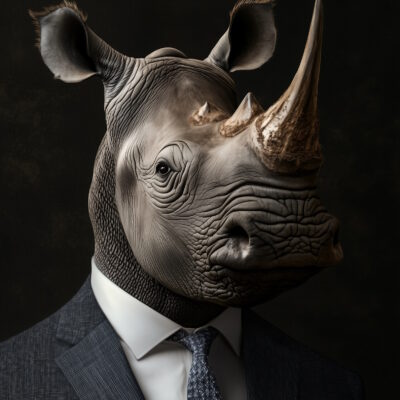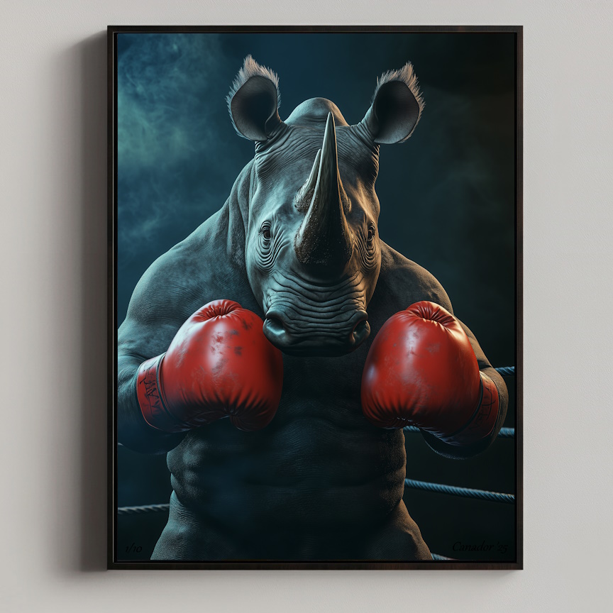 De rode handschoenen van de neushoorn branden van pure intensiteit. Dit is geen spel, geen oefening – dit is rauwe kracht in actie.