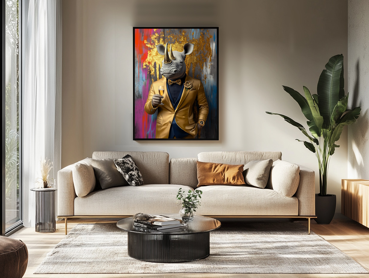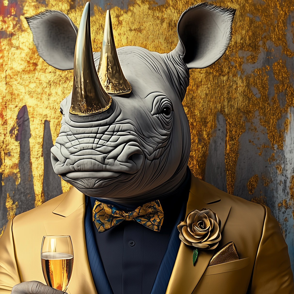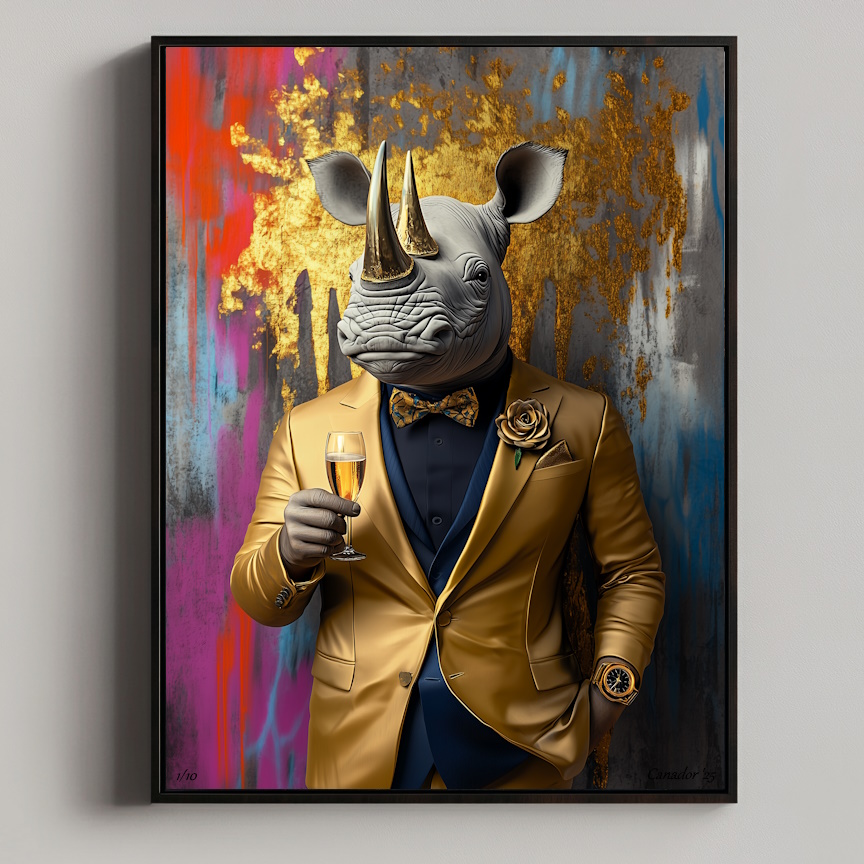 Breng kracht en vastberadenheid in jouw ruimte met Rhino – Toast to Triumph, een kunstwerk dat stoerheid en elegantie combineert. De imposante neushoorn, gekleed in een stijlvol pak en met een glas geheven in een waardige toast, staat symbool voor doorzettingsvermogen en triomf.