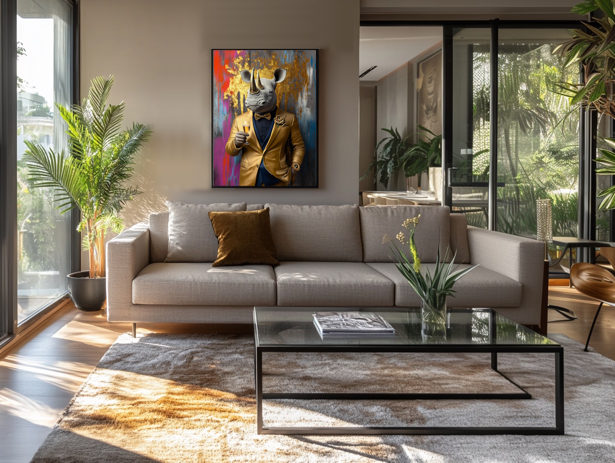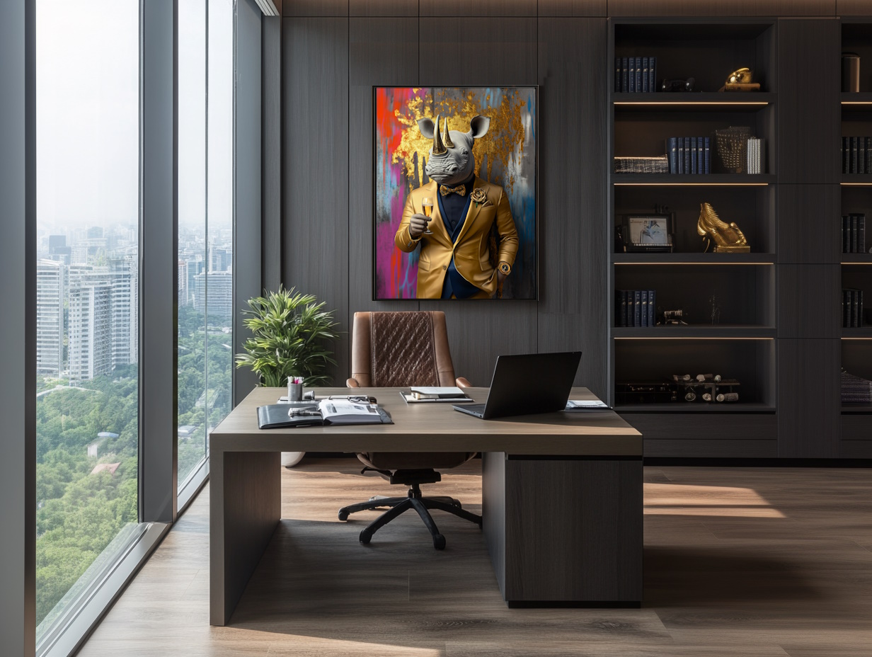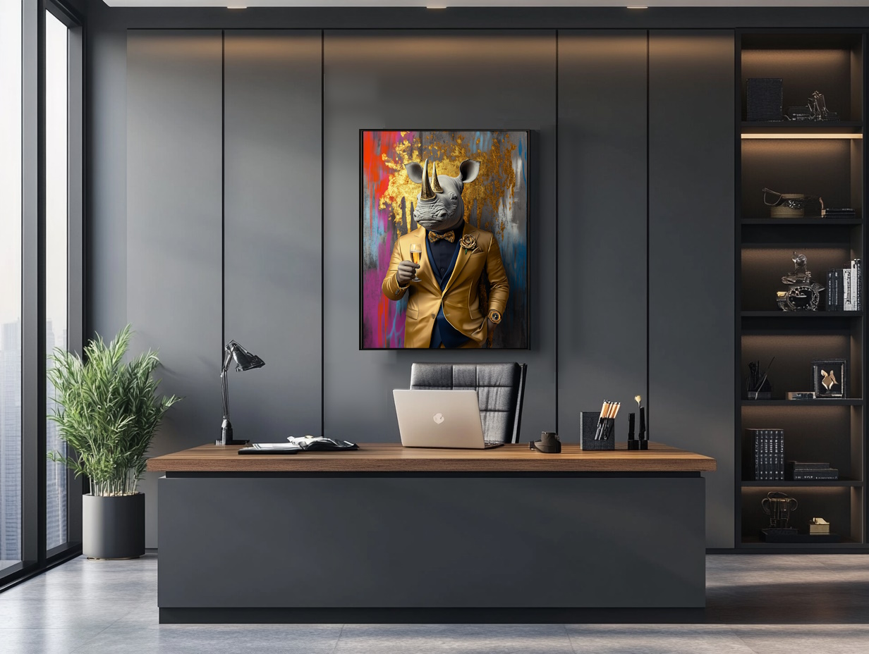 Breng kracht en vastberadenheid in jouw ruimte met Rhino – Toast to Triumph, een kunstwerk dat stoerheid en elegantie combineert. De imposante neushoorn, gekleed in een stijlvol pak en met een glas geheven in een waardige toast, staat symbool voor doorzettingsvermogen en triomf.