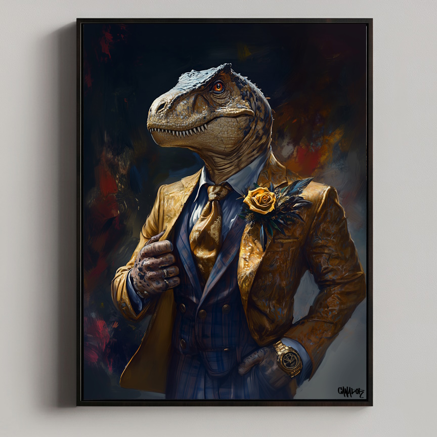 De T-Rex, de onbetwiste heerser van zijn tijd, wordt hier afgebeeld in een verrassend moderne context. Het stijlvolle pak en de krachtige houding benadrukken zijn autoriteit en maken dit kunstwerk een opvallend middelpunt in elke ruimte. Het kunstwerk daagt uit om te reflecteren op de kracht van het verleden en de elegantie van het heden.