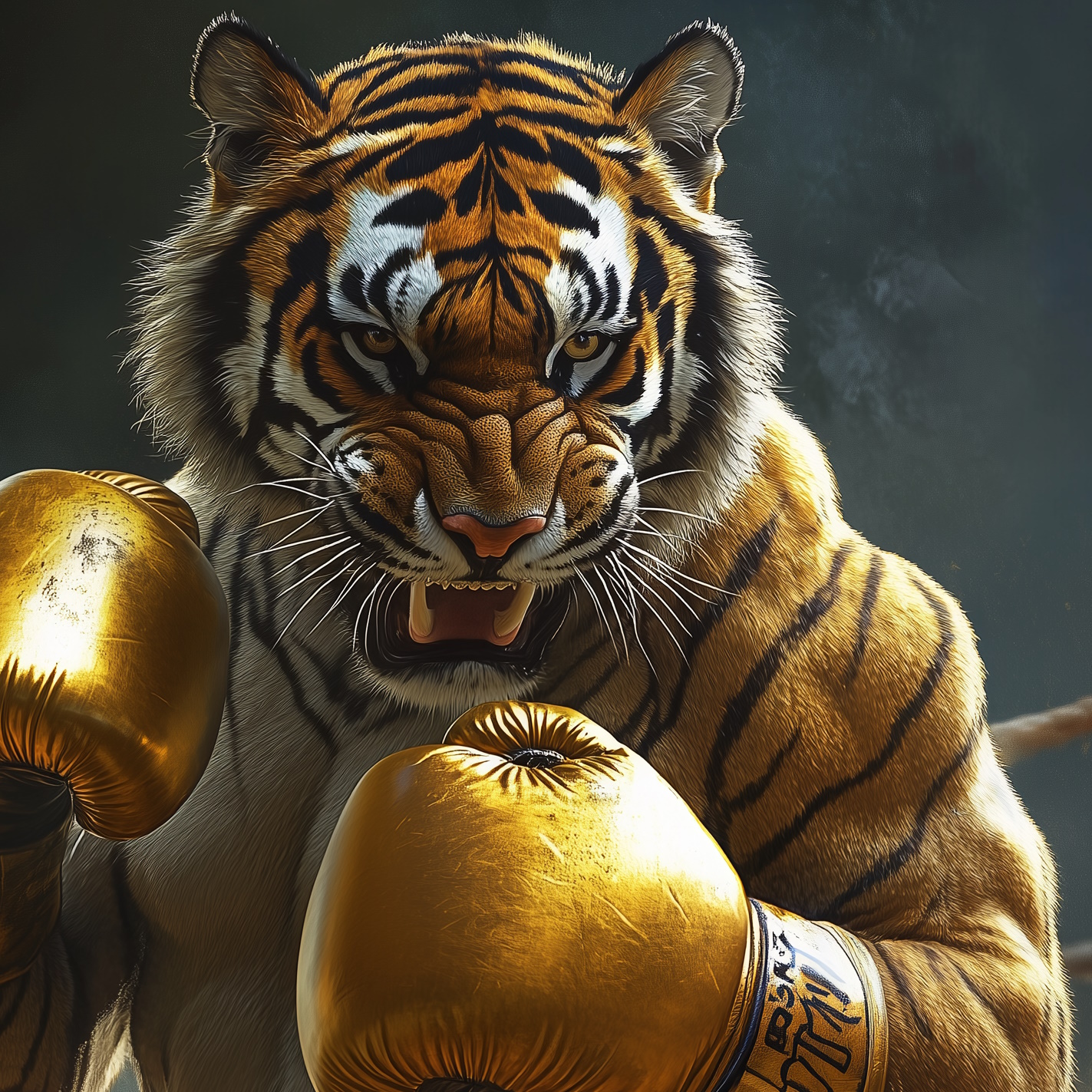 De tijger beweegt met precisie, zijn kracht is even dodelijk als zijn focus. Zijn gouden handschoenen schitteren als een belofte van perfectie.