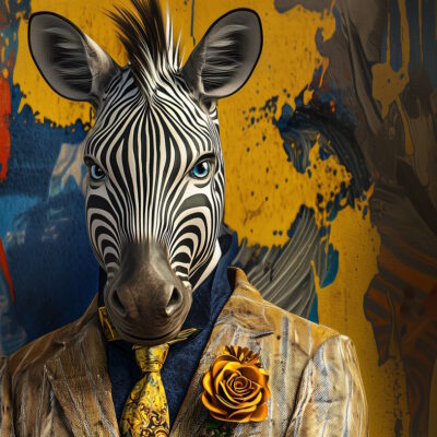 Uniek en stijlvol: Zebra – Corporate Creatures toont een zebra in een strak zakelijk pak, een kunstwerk dat uniciteit en elegantie viert.