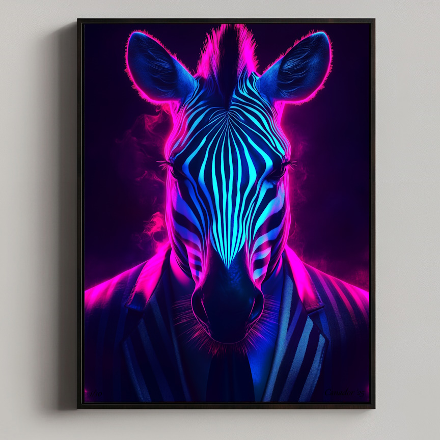 Uniek en opvallend: Zebra – Neon Instincts combineert het klassieke zwart-wit patroon met een neon-gloed die zijn onderscheidende karakter benadrukt. Een speels en stijlvol statement.